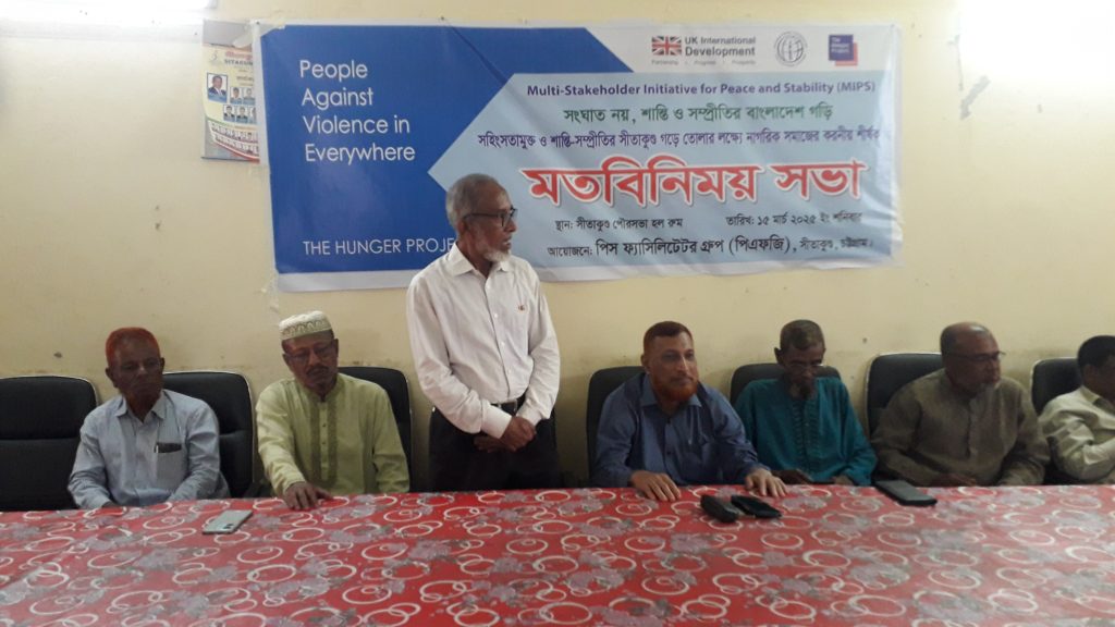ফরেইন, কমনওয়েলথ অ্যান্ড ডেভলপমেন্ট অফিস-এফসিডিও’র অর্থায়নে দ্য হাঙ্গার প্রজেক্ট; বাংলাদেশ’র মাল্টি-স্টেকহোলডার ইনিশিয়েটিভ ফর পিস অ্যান্ড স্ট্যাবিলিটি-এমআইপিস প্রকল্পের আওতায়  পিস ফ্যাসিলিটেটর গ্রুপ (পিএফজি) সীতাকুণ্ড  এই মতবিনিময়  সভার আয়োজন করেন। পিএফজি সমন্বয়কারী নাসির উদ্দিন অনিকের সঞ্চালনায় এবং পিএসজির সদস্য  বীর মুক্তিযোদ্ধা মহরম আলীর সভাপতিত্বে এতে অন্যান্য অতিথিদের মধ্যে উপস্থিত ছিলেন: বীর মুক্তিযোদ্ধা আবদুল মান্নান, পৌর বিএনপির আহব্বায়ক আলহাজ্ব মোহাম্মদ জাকের হোসেন,পৌর জামাত ও সাবেক কাউন্সিলর রায়হান উদ্দিন,বাজার কমিটির সভাপতি রেজাউল করিম বাহার,পিএফজির পিস এম্বাসেডর শামসুল আলম আজাদ,বাসদ এর জসিম উদ্দিন,ওয়ার্কার্স পার্টির উপজেলা সভাপতি আবুল কাসেম,দিশারী ফাউন্ডেশন এর চেয়ারম্যান এডভোকেট সরওয়ার হোসেন লাভলু,পৌর বিএনপির সদস্য সচিব সালহ আহমেদ সলু,সীতাকুণ্ড প্রেসক্লাবের প্রচার_প্রকাশনা সম্পাদক সঞ্জয় চৌধুরী,পিস এম্বাসেডর মাসুদা খায়ের,পিস এম্বাসেডর শামীম আক্তার লাভলী,ইয়ুথ পিস এম্বাসাডর গ্রুপের সমন্বয়কারী ফরহাদ হোসাইন রিফাত,খেলাঘর সীতাকুণ্ড শাখার জাহেদুল ইসলাম বিটু,পিএফজি সদস্য এম এ কাইয়ুম, দি হাঙ্গার প্রজেক্ট এর সমন্বয়কারী  এফসি মাইনুল ইসলাম সহ আরো অনেকেই।