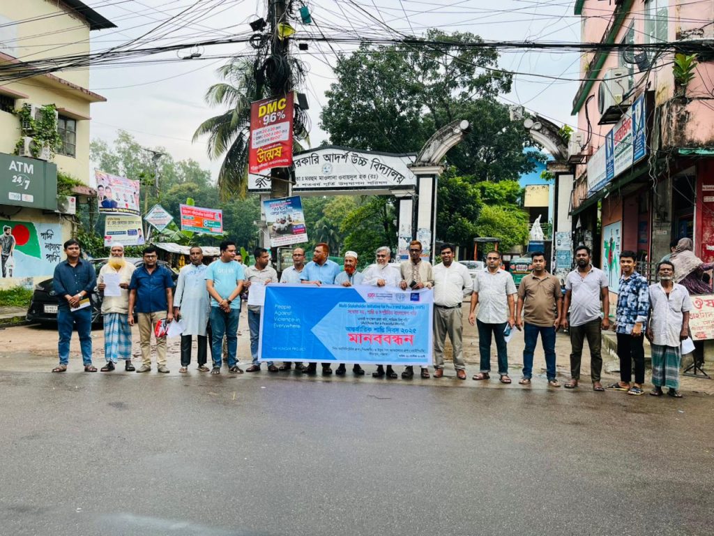 সীতাকুণ্ডে আন্তর্জাতিক শান্তি দিবস পালনে মানববন্ধন করা হয়েছে। ” এখনই পদক্ষেপ গ্রহণ করি, শান্তিময় বিশ্ব গড়ি” এই প্রতিপাদ্য বিষয়কে সামনে রেখে ২১ সেপ্টেম্বর রবিবার দি হাঙ্গার প্রজেক্ট বাংলাদেশর MIPS প্রকল্পের উদ্যোগে সীতাকুণ্ড পৌরসভার সামনে এই মানববন্ধন করা হয়। পিচ ফেসিলেটর গ্রুপ (পি এফ জি) ইউথ ফিস অ্যাম্বাসেডর গ্রুপ এর অংশ গ্রহণে মানববন্ধনে উপস্থিত থেকে বক্তব্য রাখেন সীতাকুণ্ড উপজেলা বিএনপির আহবায়ক ড কমল কদর, উপজেলা জামাতের সাবেক আমির মাওলানা তহিদুল হক, চট্টগ্রাম জেলা বিএনপির সদস্য কাউন্সিলর শামসুল আলম আজাদ, পিএফজির সমন্বয়কারী মোহাম্মদ নাসির উদ্দিন অনিক, উপজেলা জাসদের আহবায়ক জসীম উদ্দীন মোবারক, সীতাকুণ্ড প্রেসক্লাবের সাধারণ সম্পাদক কাইয়ুম চৌধুরী, ইউথ গ্রুপের সমন্বয়কারী রিফাত প্রমূখ। বক্তারা বলেন, জুলাই আন্দোলনের পরবর্তী মব সন্ত্রাস, রাজনৈতিক সহিংসতা, ভিন্ন মতাঅবলম্বীদের উপর নিপিডন, অসহিষ্ণুতার এক ভয়াবহ মানবিক বিপর্যয়ের মধ্য দিয়ে আমরা দিনাতিপাত করছি। তাই আন্তর্জাতিক শান্তি দিবসে দাঁড়িয়ে আমরা আমাদের সমাজ ও রাষ্ট্রে শান্তি সম্প্রীতি প্রতিষ্ঠা তথা বিশ্বমানবতার স্বপক্ষে সকলকে ঐক্যবদ্ধভাবে এগিয়ে আসার আহ্বান জানাই